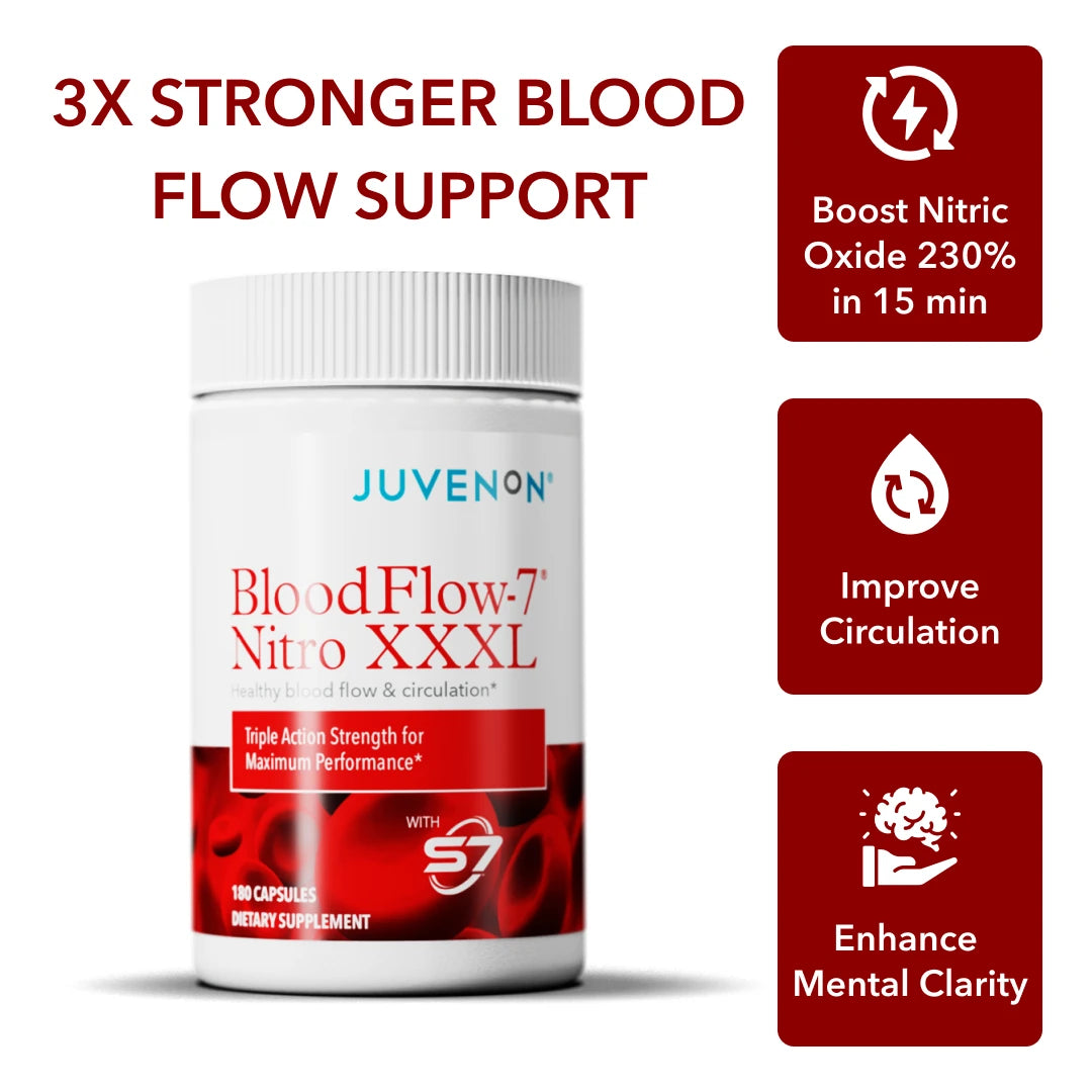 Juvenon BloodFlow-7 XXXL is an extra-strength formulation for individuals who may require a stronger option. It is an extended version of this, prescribed for those with increased needs for circulatory support, as dictated by their lifestyle, age, or athletic performance. It contains more ingredients and a larger dose to maximize the effects of the nitric oxide boost on the cardiovascular system. The supplement aids in quick recovery, improved oxygen transportation, and decreased muscular fatigue, making it a viable option for active individuals or those with chronic circulation issues.